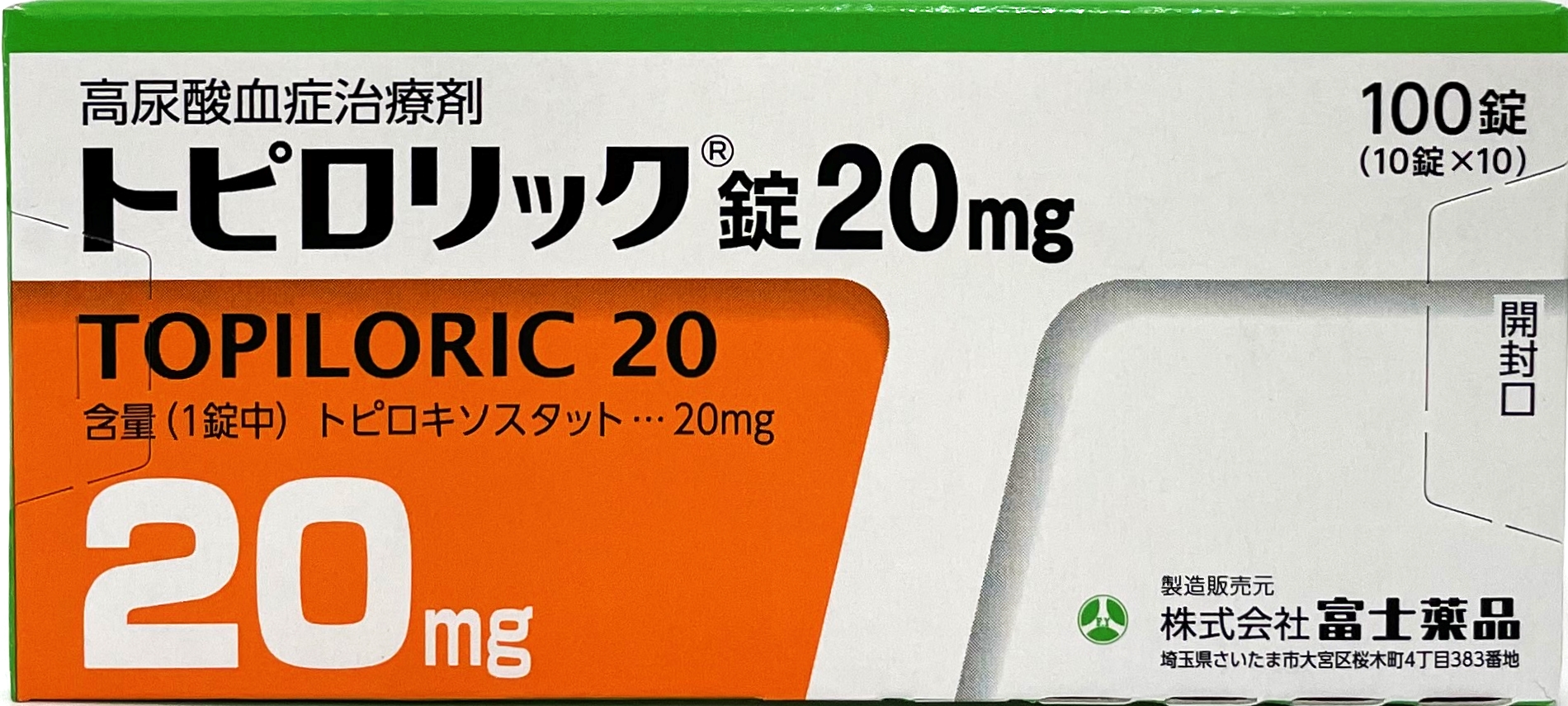 通常、成人にはトピロキソスタットとして1回20mgより開始し、1日2回朝夕に経口投与する。その後は血中尿酸値を確認しながら必要に応じて徐々に増量する。維持量は通常1回60mgを1日2回とし、患者の状態に応じて適宜増減するが、最大投与量は1回80mgを1日2回とする。
