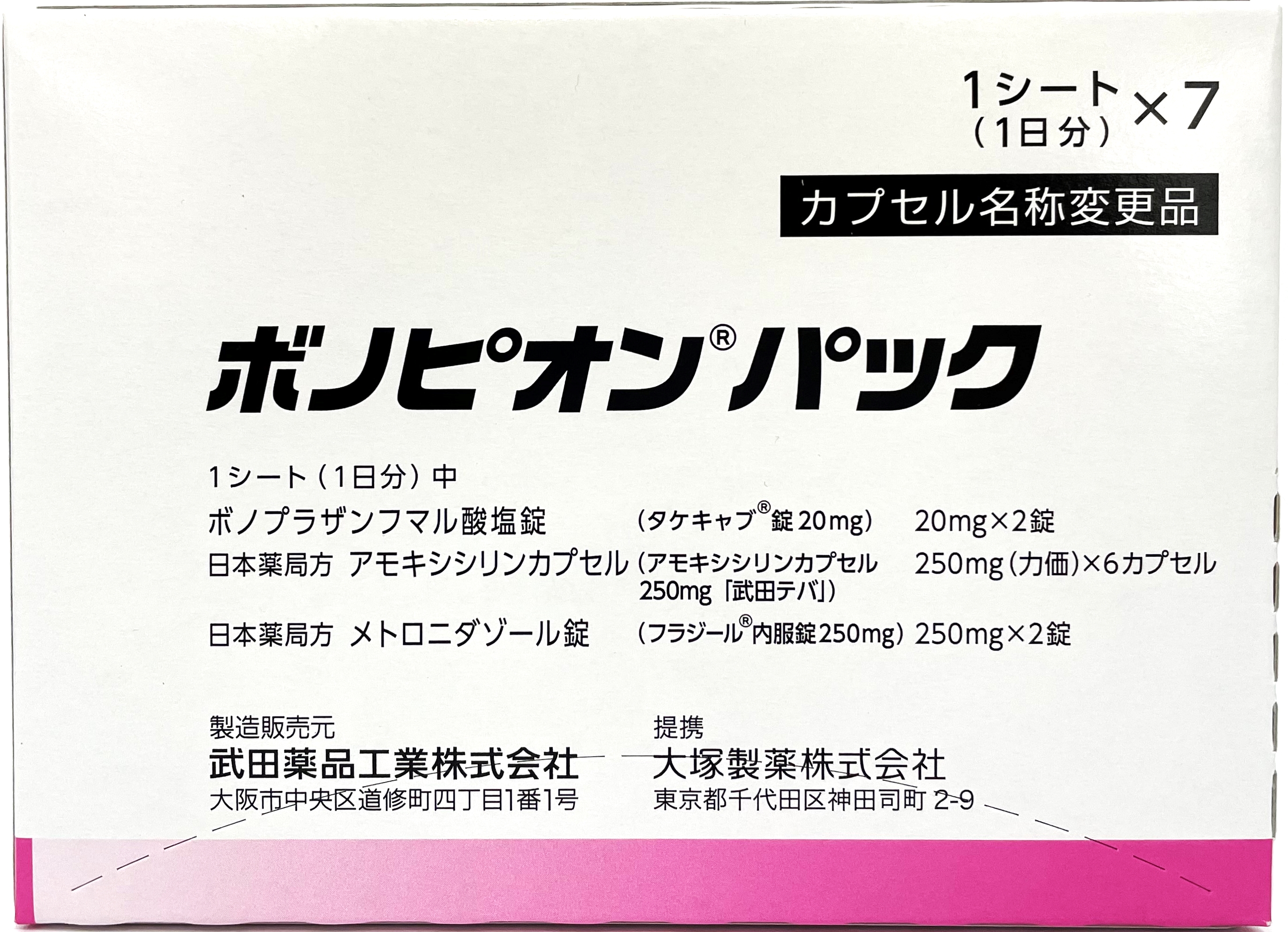 用法、用量 | プロトンポンプインヒビター、アモキシシリン水和物及びクラリスロマイシンの3剤投与によるヘリコバクター・ピロリの除菌治療が不成功の場合 通常、成人にはボノプラザンとして1回20mg、アモキシシリン水和物として1回750mg(力価)及びメトロニダゾールとして1回250mgの3剤を同時に1日2回、7日間経口投与する。 |